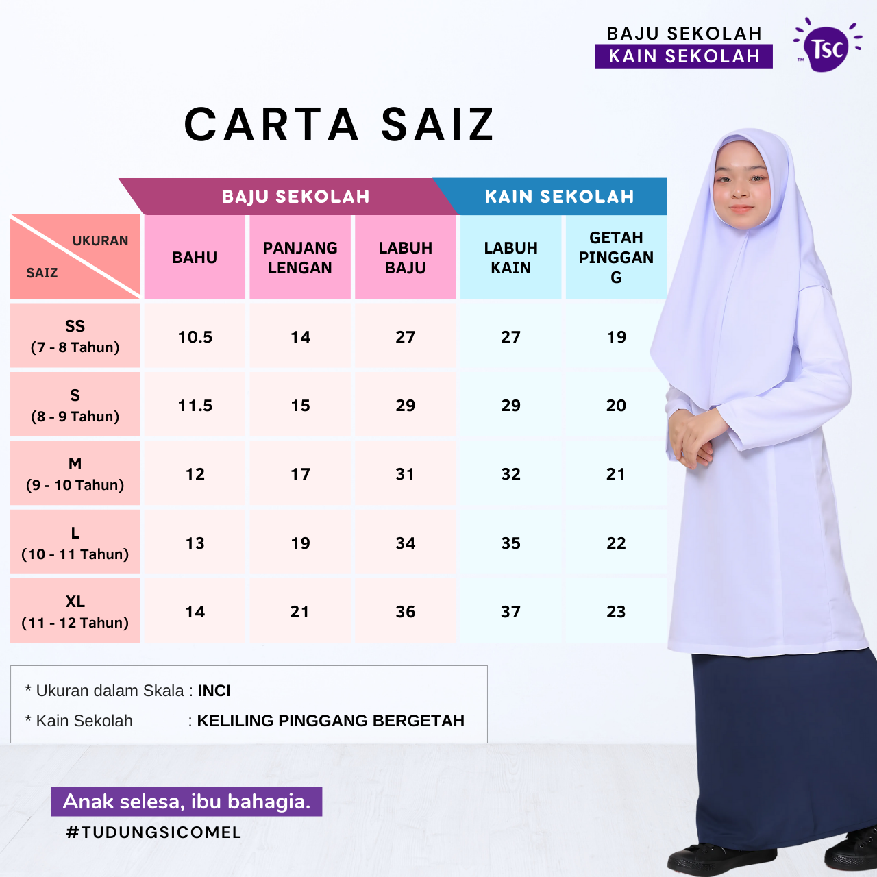 Untuk memastikan Si Comel puan SELESA dengan set baju sekolah yang kita hasilkan, 2 ukuran yang penting untuk puan ukur adalah: